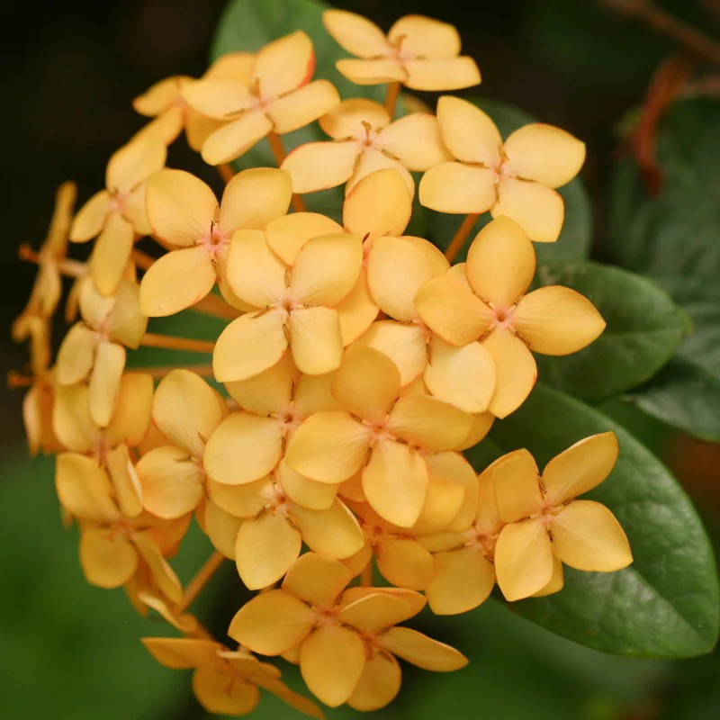 Ixora is a genus of tropical evergreen flowering shrubs known for their vibrant, star-shaped blossoms and glossy, dark green leaves. Native to tropical and subtropical regions, these plants are popular as ornamental garden shrubs and hedges worldwide.